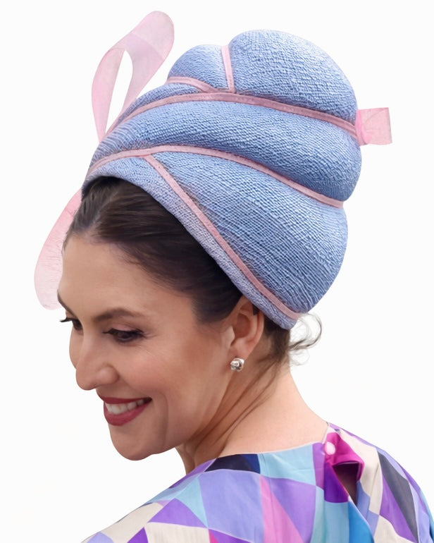 Vintage turban block, blocked with blue straw and finished with pink braid and crinoline bows. Modelled/entered by Demi Monde during VRC’s lockdown competitions.